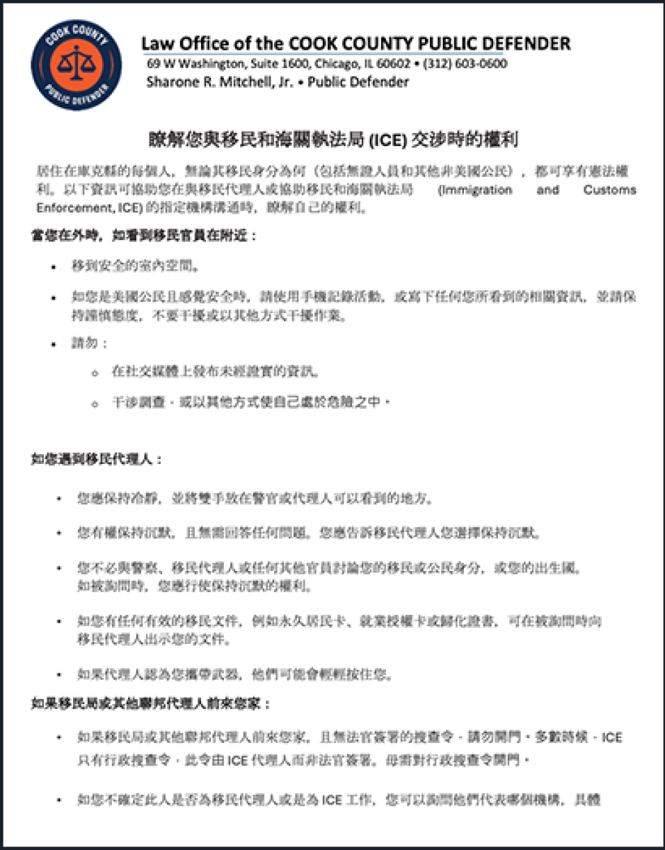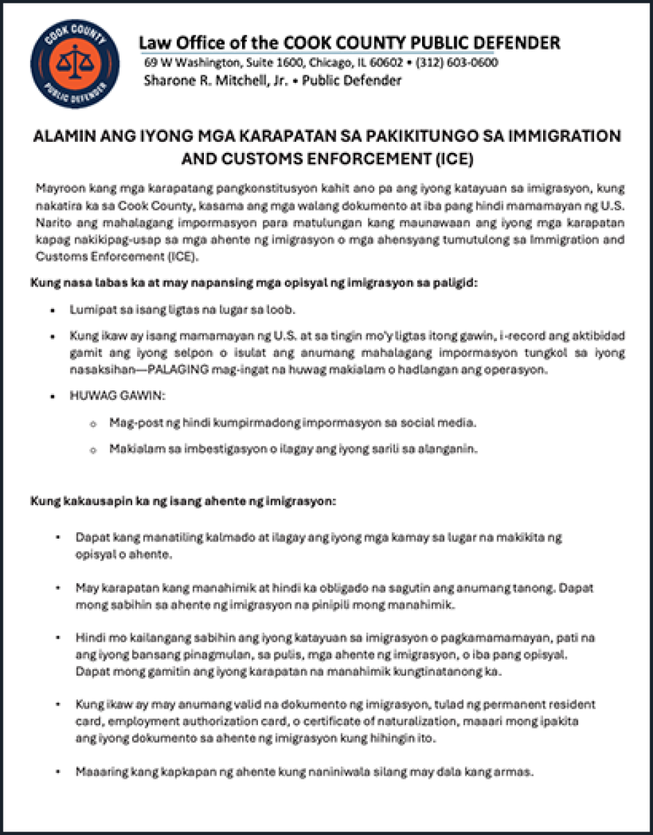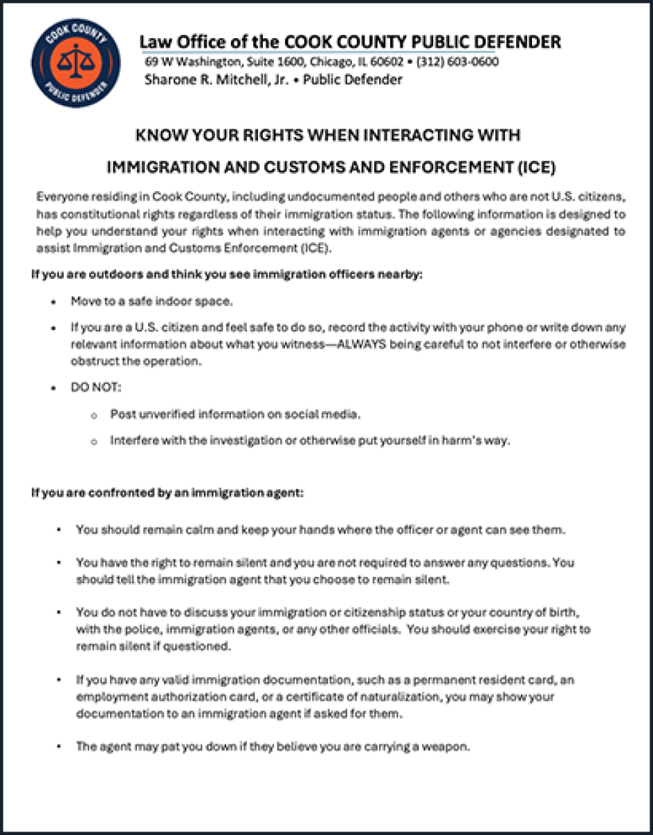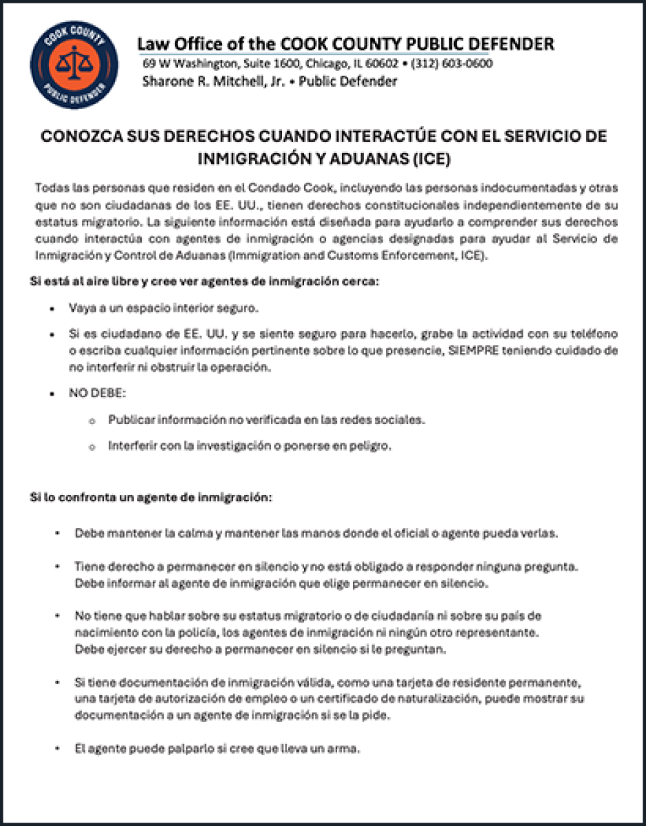 Todas las personas que residen en el Condado Cook, incluyendo las personas indocumentadas y otras que no son ciudadanas de los EE. UU., tienen derechos constitucionales independientemente de su estatus migratorio. La siguiente información está diseñada para ayudarlo a comprender sus derechos cuando interactúa con agentes de inmigración o agencias designadas para ayudar al Servicio de Inmigración y Control de Aduanas (Immigration and Customs Enforcement, ICE).