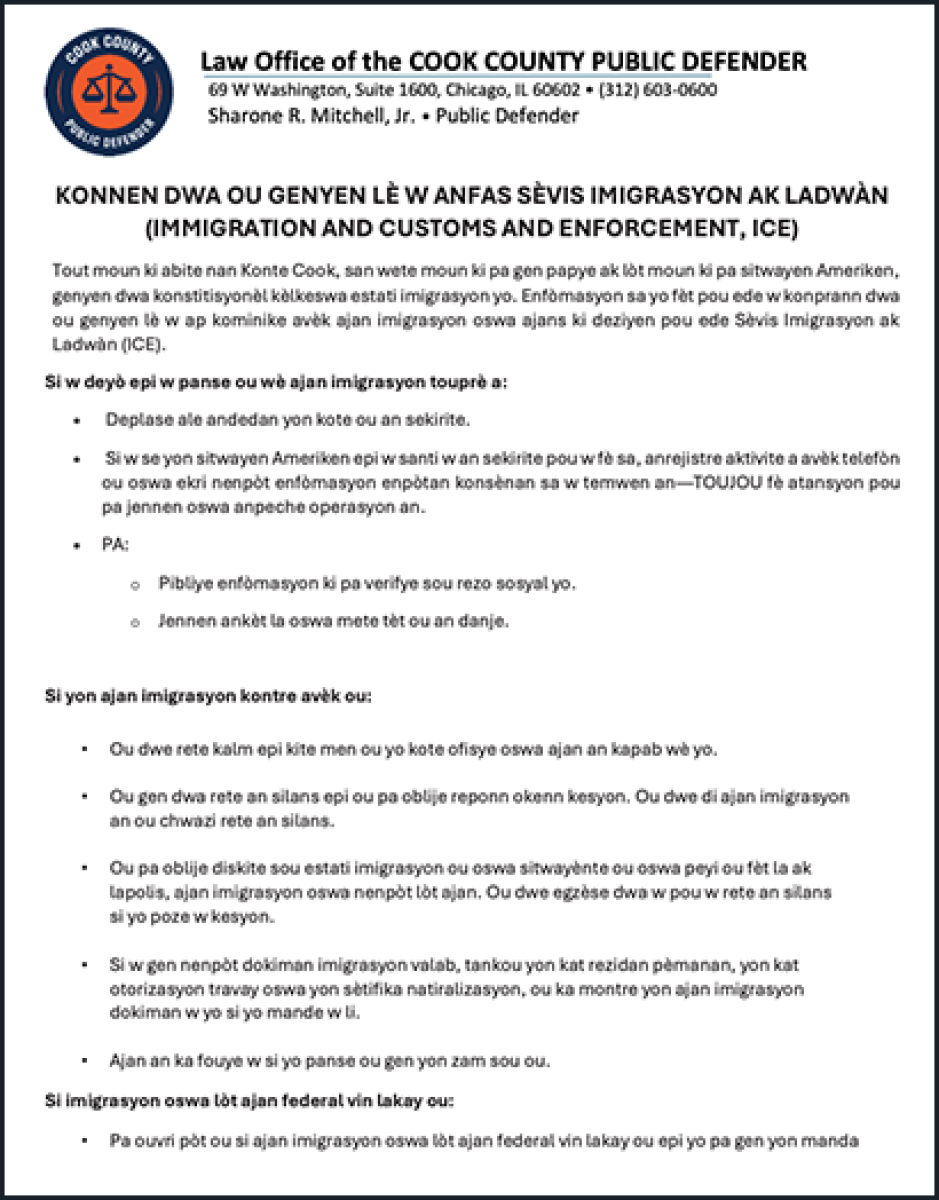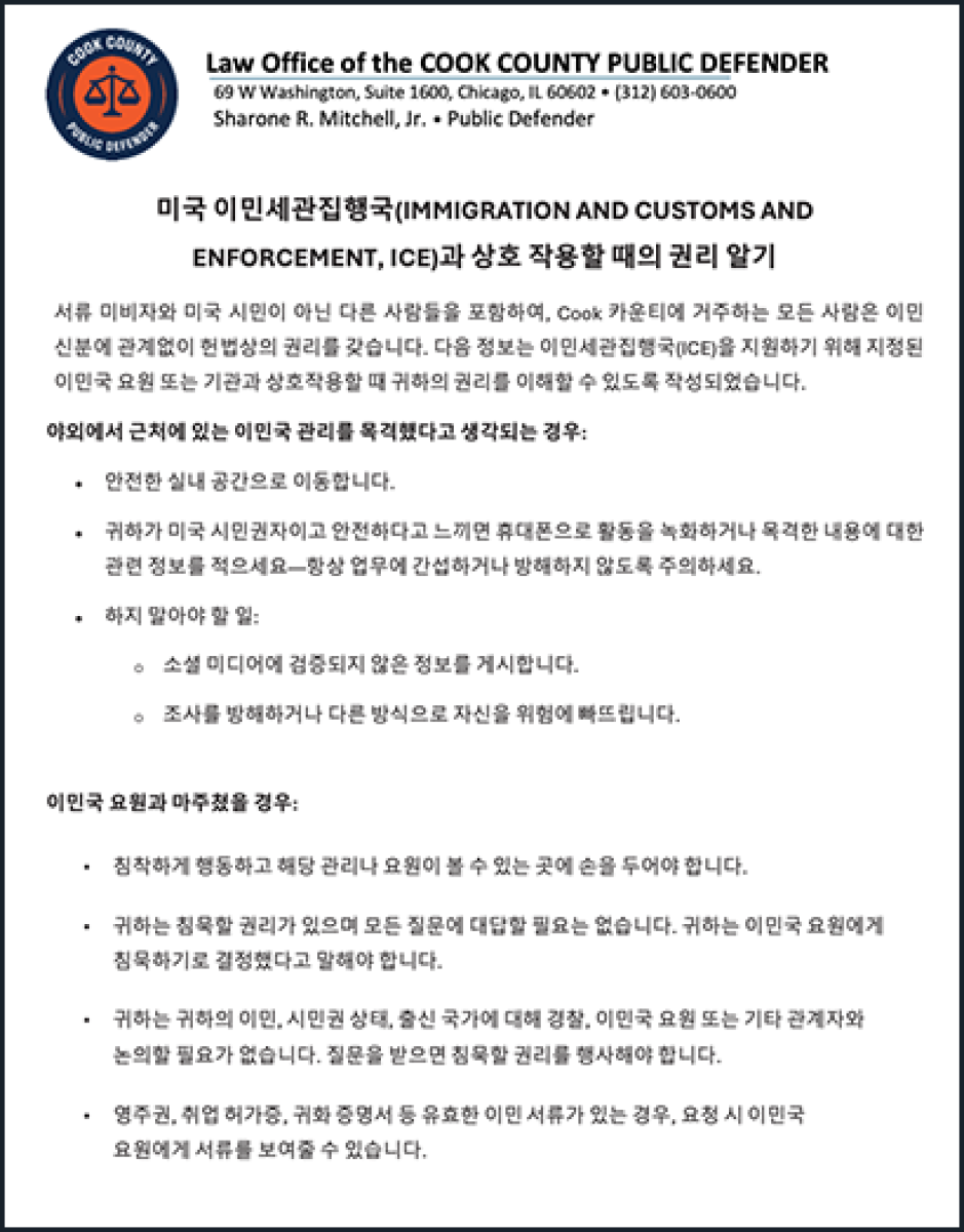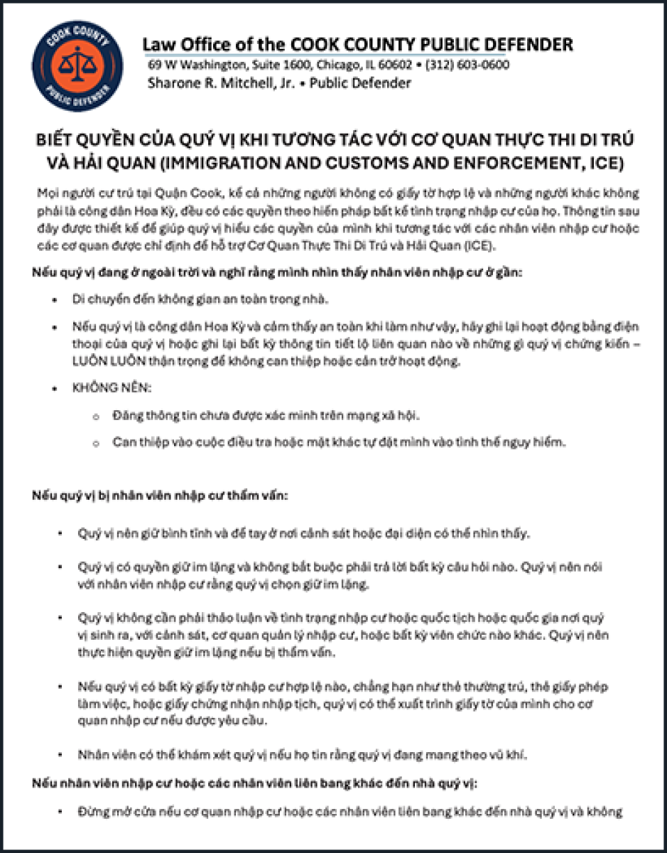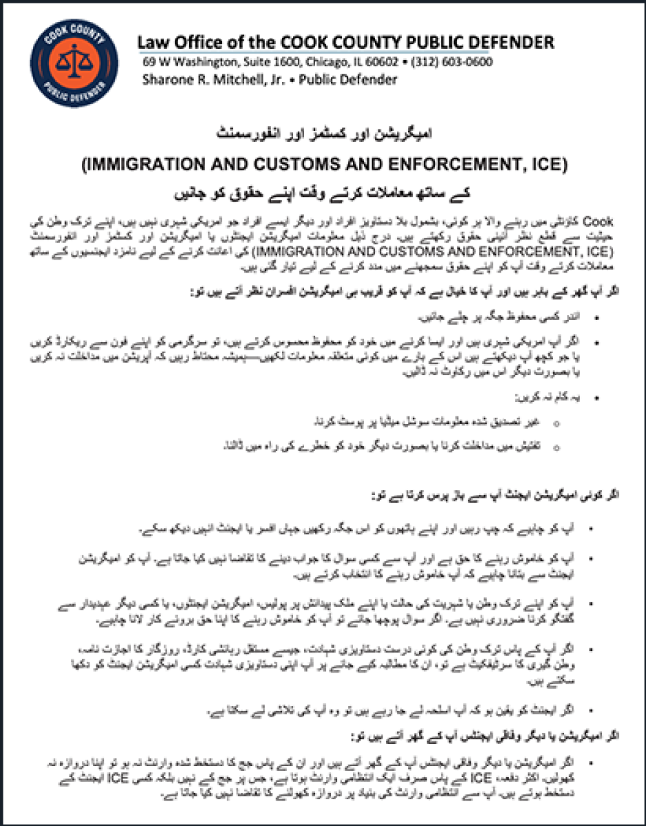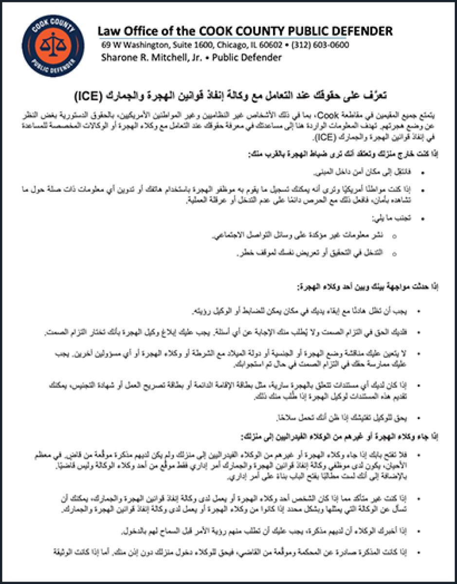 Todas las personas que residen en el Condado Cook, incluyendo las personas indocumentadas y otras que no son ciudadanas de los EE. UU., tienen derechos constitucionales independientemente de su estatus migratorio. La siguiente información está diseñada para ayudarlo a comprender sus derechos cuando interactúa con agentes de inmigración o agencias designadas para ayudar al Servicio de Inmigración y Control de Aduanas (Immigration and Customs Enforcement, ICE).