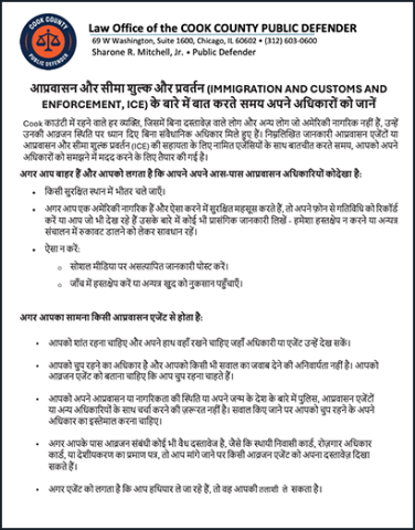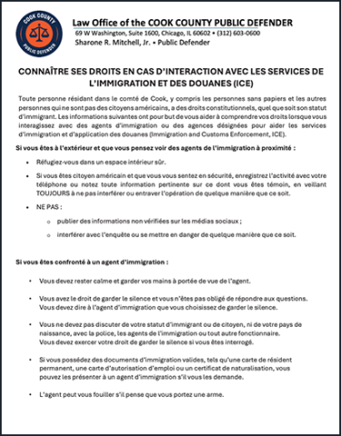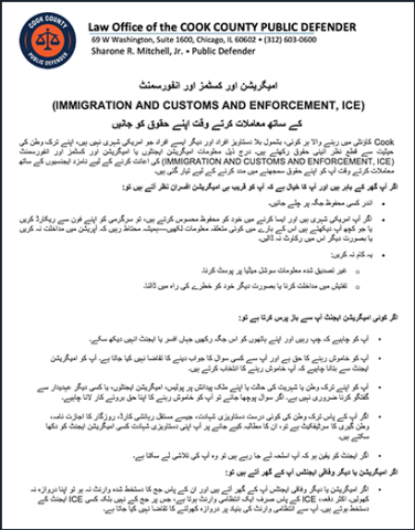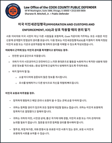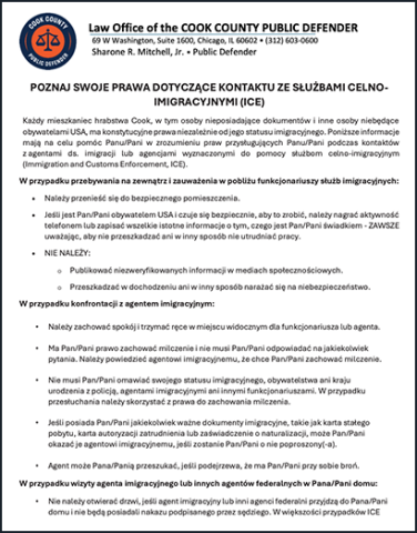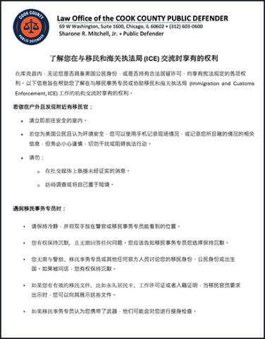 Everyone residing in Cook County, including undocumented people and others who are not U.S. citizens, has constitutional rights regardless of their immigration status. The following information is designed to help you understand your rights when interacting with immigration agents or agencies designated to assist Immigration and Customs Enforcement (ICE).