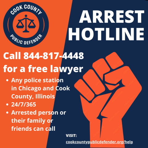The Cook County Public Defender’s Arrest Hotline – 844-817-4448 – operates 365 days a year, 24 hours a day, taking calls and providing vital legal representation for people being detained by law enforcement anywhere in Chicago and Cook County.