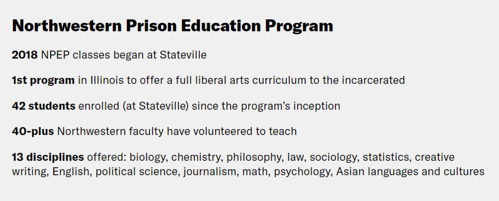 NPEP is a partnership between Northwestern and the Illinois Department of Corrections that grants college credit through the University’s School of Professional Studies and in collaboration with Oakton Community College. Upon fulfillment of course requirements, NPEP students are eligible to earn an associate degree in general studies from Oakton. The program, founded and directed by Northwestern philosophy professor Jennifer Lackey, is the first in the state to offer a full liberal arts curriculum.