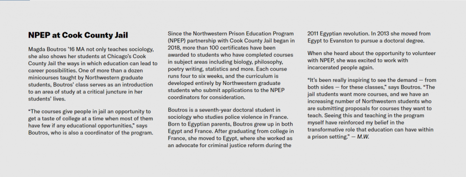 “Hearing from our professors, students and volunteers, it’s clear that NPEP has had a positive impact on the entire Northwestern community,” says Lackey.
