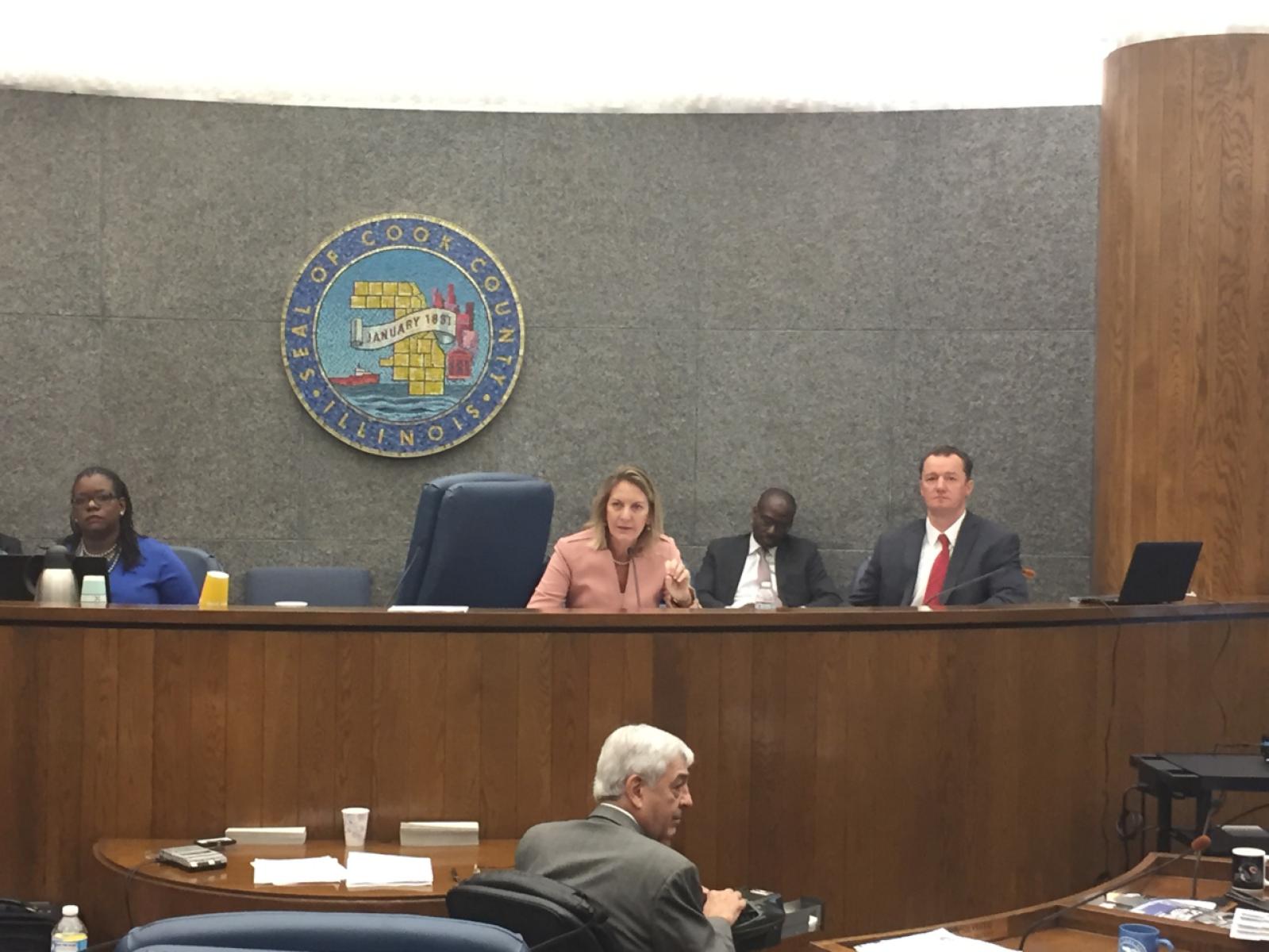 Amy Campanelli defends her budget before the Cook County Board of Commissioners. She warns that any cuts to her budget will result in less service to the citizens of Cook County as well as higher costs for representing the accused.