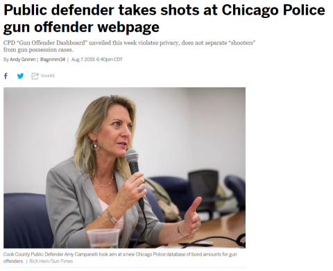 The Chicago Police Department’s new online database showing bond amounts for people charged with gun crimes needs to be taken down, Cook County Public Defender Amy Campanelli said Wednesday.