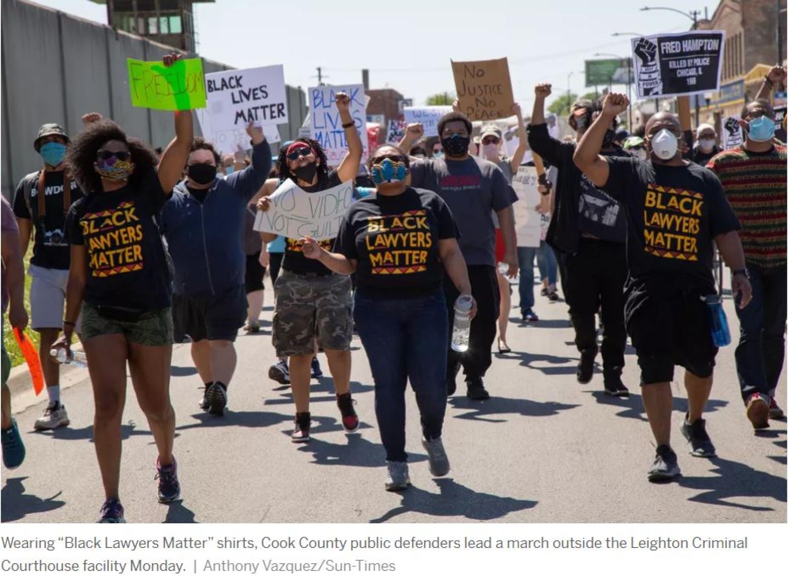 Lawyers from the Cook County public defender office led a Black Lives Matter march around the Leighton Criminal Courthouse and jail facility Monday afternoon.